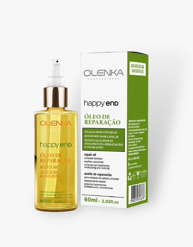 O tratamento por meio de seleção cuidadosa de 7 óleos Argan, ojon, macadâmia, mirra, cálamo, monoi e buriti, ricos em ômega 6 e 9. O Óleo de Reparação Happy End Olenka promove hidratação intensa, retenção hídrica e recuperação dos lipídios naturais dos cabelos danificados.